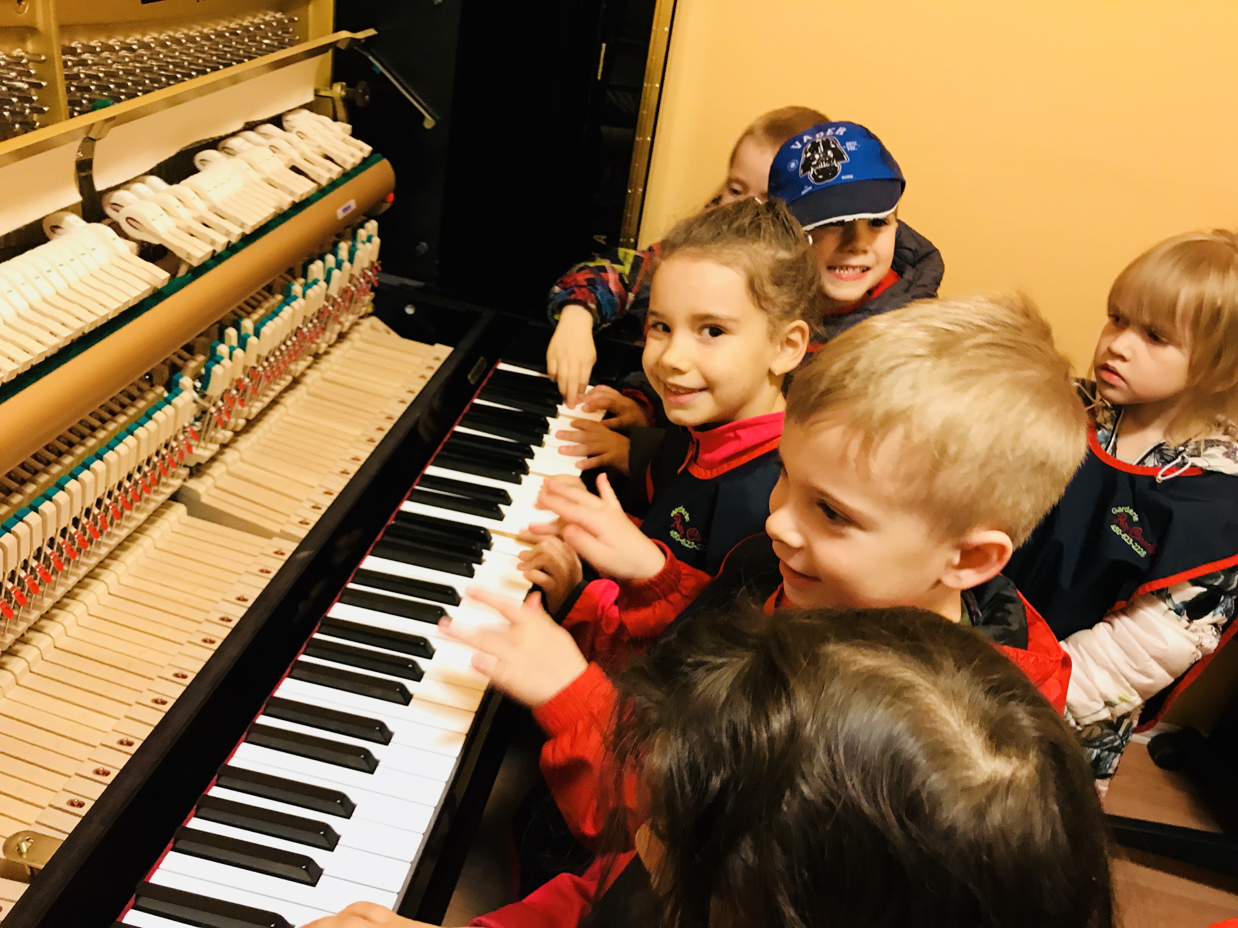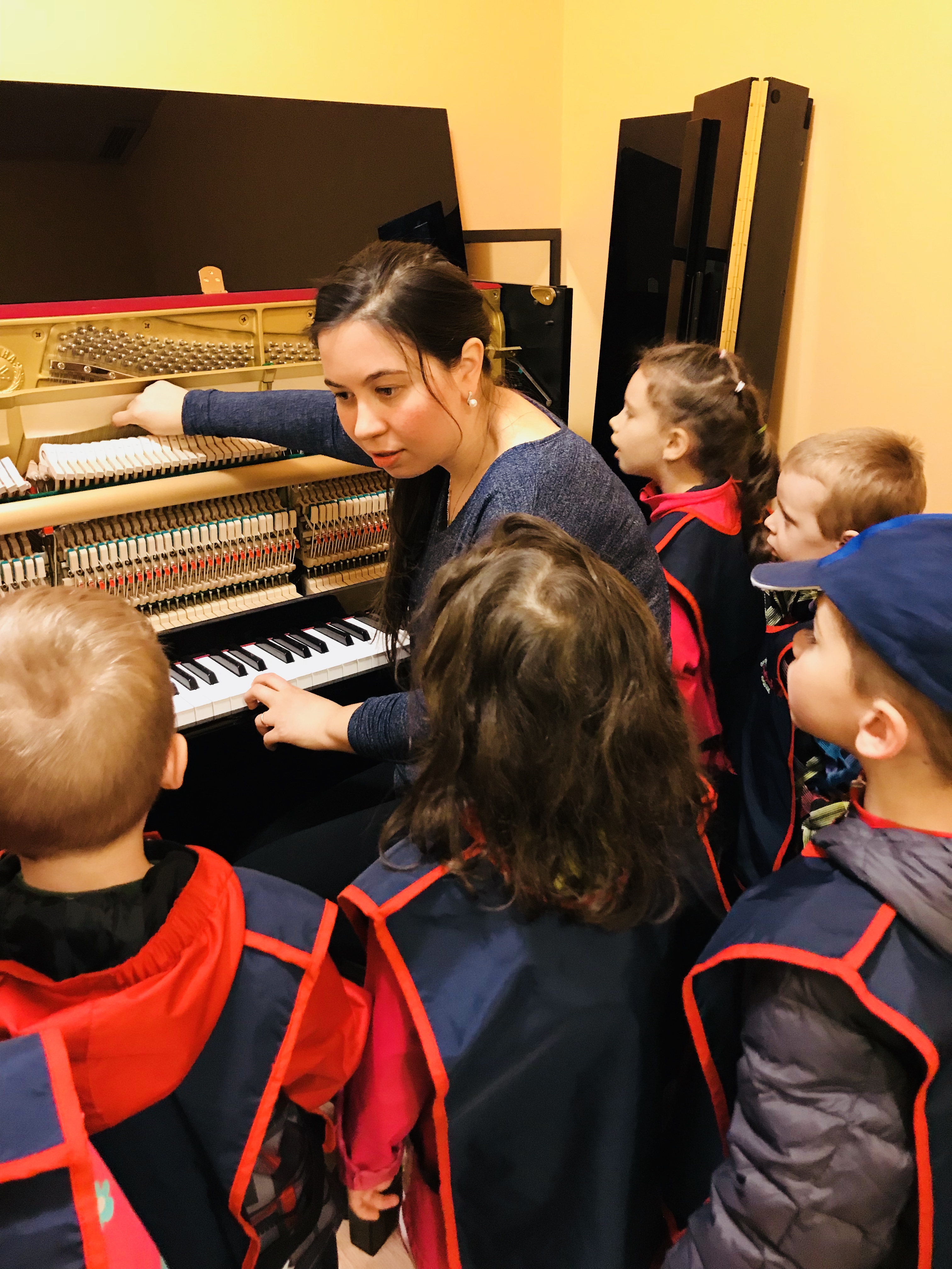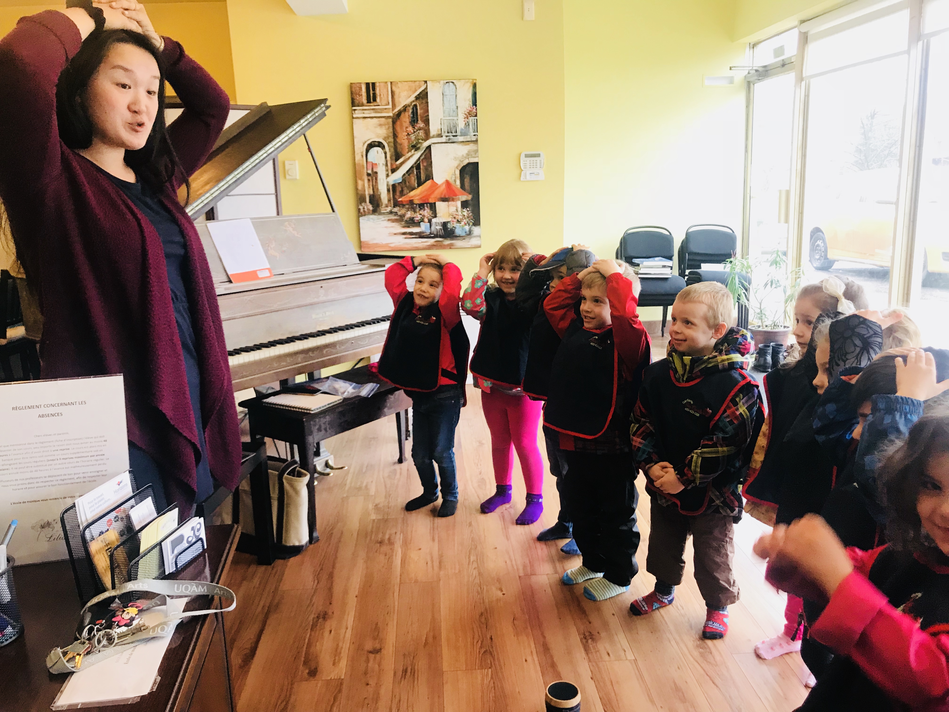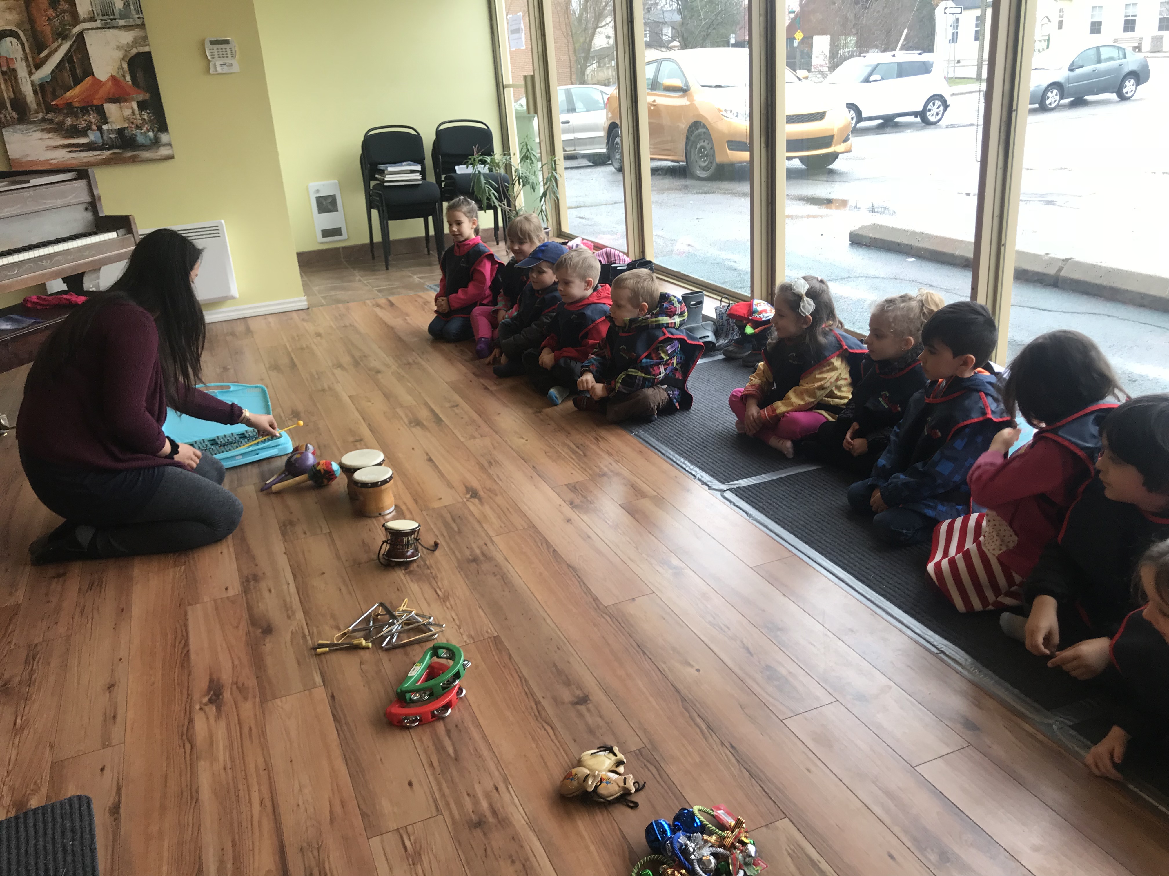 Les enfants de 4-5 ans du groupe des Papillons ont visité l'École de musique Lilianne. Ils ont eu l'occasion et le plaisir d'apprendre sur les différents instruments de musique: le piano, la guitare, le ukulélé, le triangle, les tambourins et la baterie, le violon et beaucoup d'autres. Ani, la directrice de l'école, a montré aux enfants ce qu'il y a en dedans d'un piano qui fait produire les sons. Elle a aussi fait un jeu de devinette musicale avec les enfants. Ils essayaient de deviner quelle chanson elle jouait au piano. Les enfants ont aussi fait un test pour voir si Ani pouvait jouer des chansons qu'ils nommaient :)