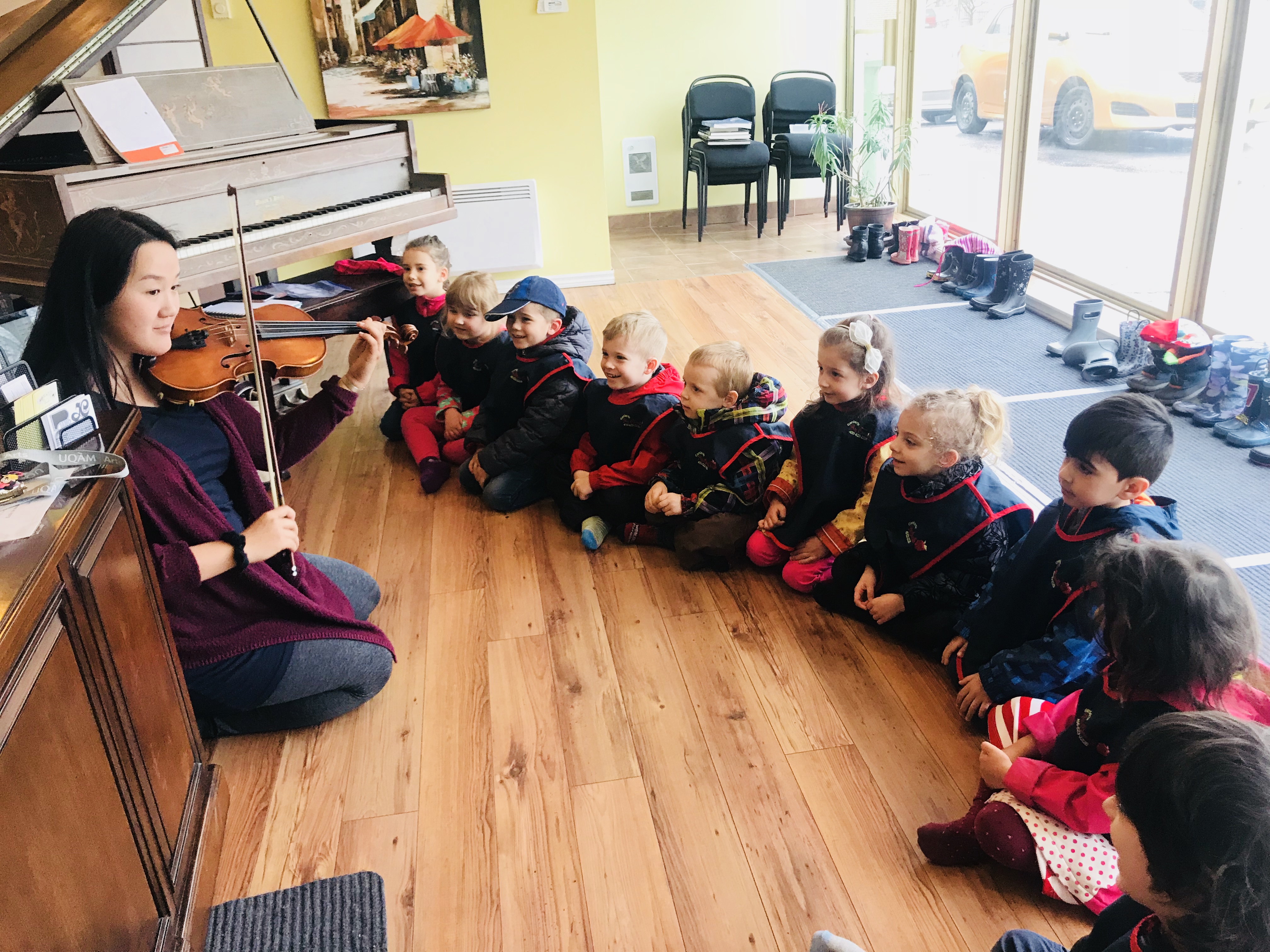 Les enfants de 4-5 ans du groupe des Papillons ont visité l'École de musique Lilianne. Ils ont eu l'occasion et le plaisir d'apprendre sur les différents instruments de musique: le piano, la guitare, le ukulélé, le triangle, les tambourins et la baterie, le violon et beaucoup d'autres. Ani, la directrice de l'école, a montré aux enfants ce qu'il y a en dedans d'un piano qui fait produire les sons. Elle a aussi fait un jeu de devinette musicale avec les enfants. Ils essayaient de deviner quelle chanson elle jouait au piano. Les enfants ont aussi fait un test pour voir si Ani pouvait jouer des chansons qu'ils nommaient :)